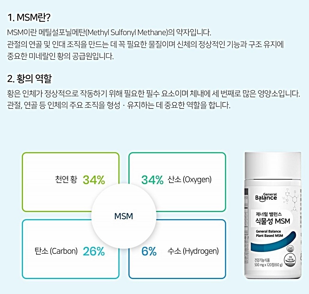msm의 효능msm이란? MSM은몸 속 글루타치온 농도를 증가시키는 성분이지요. 사람의 몸의 기본적인 항산화물질 글루타티온의 합성에도 유황 물질이 깊이 관여되어 있다고 합니다. 글루타티온을 만들 때 필요한 3개의 아미노산 중 한 종류류인시스테인 성분의 전구물질은 '메티오닌'인데 이 성분은 유황을 포함하는 아미노산이지요. 유기 유황 화합물은몸몸에도 존재하는 성분이며, 머리카락이나 연골, 콜라겐, 피부조직 등을 창조되는데 틀림없이 필요한 성분이지요. 이 성분은 나이가 들면서 감퇴하는 성분이라고 알려져 있기 때문에 40대 차후 나이가 들기 착수하면 외측에서 본격적으로 섭취해주는 것이 중요하다고합니다.