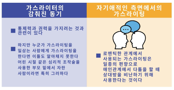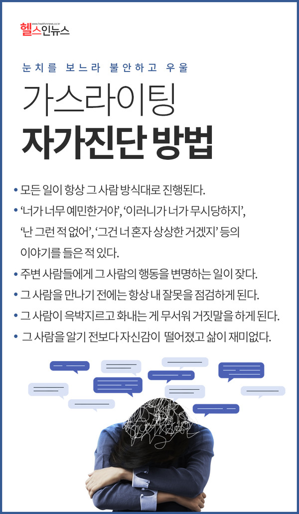 가스라이팅은 어느 사람의 심리상태를 교묘하게 조작하여 그 사람이 자기 자신에 대하여 불신하도록 해주고 가해한 인류에게 정도가 심하게 의존하게 생성하는 심리적 학대를 뜻하며 심리적 지배라고도 하고요. 가스라이팅 1938년 연극 '가스등' 연극에서 유래한 용어로 현실인지 실력을 잃고 가해자에게 의존하게 만들어요.
