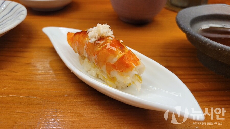 츠마미 차후 본식적으로 스시가 발생되는 있는데, 흰살 생선을 비롯해서 붉은살 생선, 갑각류, 조개류, 성게나 아귀, 간, 군함말이 등이 나와요. 중간중간에 식당에 따라 알 부류 및 미니덮밥 등이 추가되고요. 대다수 장어초밥이나 후토마키가 나오면서 스시는 마무리되고요.