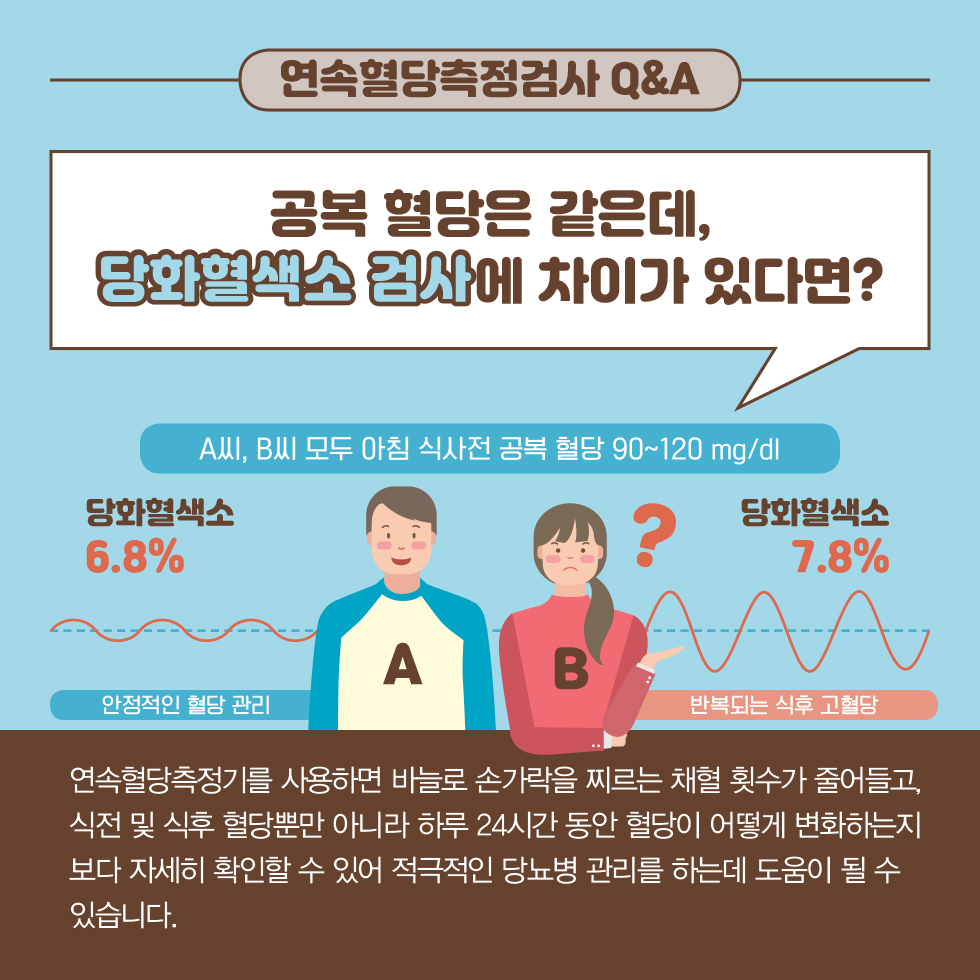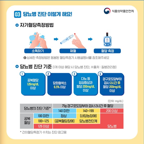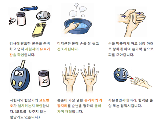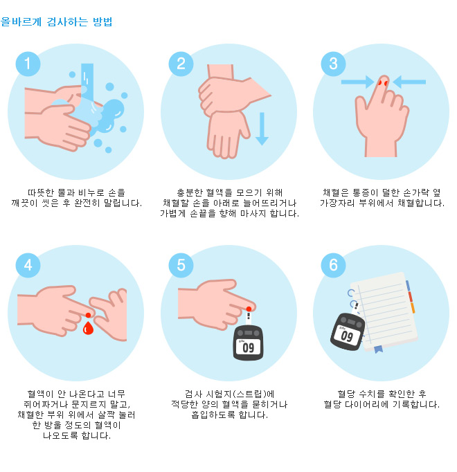 주기적인 혈당 검사와 당화혈색소 검사를 통해 혈당 컨트롤 상태를 포착하고, 대응를 취하여 합병증의 발생을 막을 수 있다고 합니다.