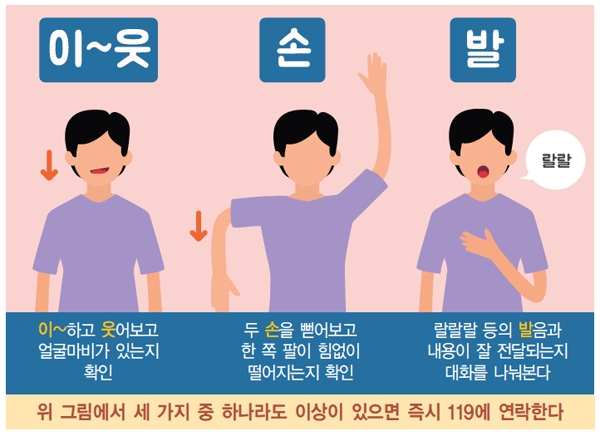 말투가 어눌한지, 짧은 문장을 거듭해서 말해달라는데 알아듣지 못하고 혼란스러워하는지 확인하기 T(시간): 위 세 가지 증상이 나타나면 망설이지 말고, 즉시 119를 부르기 (※ 환자가 의식을 잃으면 심폐소생술하기. 마사지로 시간지연 금물)