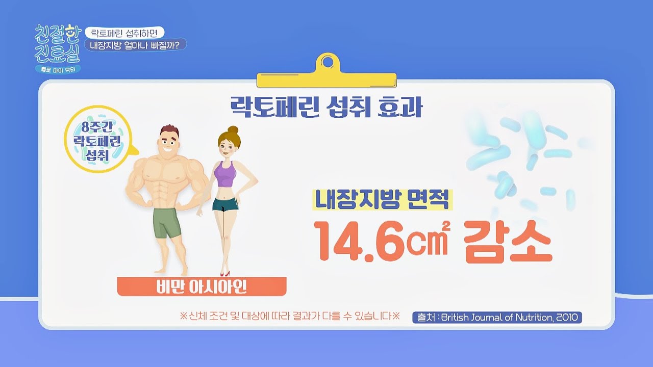 락토페린은 식약처로부터 신진대사를 촉진하여 체지방을 저하시키는 효과가 있다고 인정받았으며, 일본 lion사 실험에서 과체중 성인 20~60세 대상으로 하루 300mg 락토페린을 8주간 흡수하게 한 결과 평균적으로 실험 참가자들의 체중과 허리 및 엉덩이 둘레가 감소된 결과가 나왔습니다. 또 이상지질혈증과 동맥경화가 발생한 돼지에게 8주간 하루 500mg의 락토페린을 흡수하게 한 결과 돼지 혈액 내 중성지방과 콜레스테롤 수치가 감소되었다고합니다. 이로써 락토페린은 체지방 감소에 도움이 된다고 할 수 있습니다.