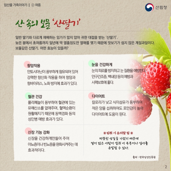 산딸기는 비타민 C와 폴리페놀 등의 항산화 물질이 대부분입니다. 이들 물질들은 우리 몸의 면역체계를 강화시키는데 도움을 주며, 감기와 같은 질병을 억제하여하는데 효력을이예요