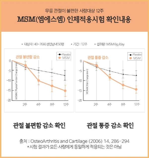 다섯번째로는 통증 완화, msm의 천연 통증 완화 기능은 내성이 생기지 않으며 다른 안 좋은 작용들이 생기지 않는데 msm이 통증의 발현지에 반응해서 망가진 세포를 재생시키고 온도감각을 조달하는 C-fiber라는 신경섬유를 통해 보급되는 통증을 막아준다고 해서다. 한 연구에서 50세 이상 100명을 대상으로 3개월 동안 msm 1200mg를 섭식하도록 하니 관절의 통증, 보행, 계단 등에서 유연성과 통증이 보완되는 msm의 효능이 있어요.