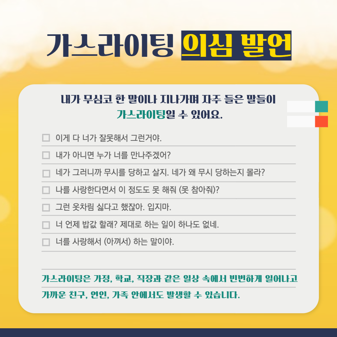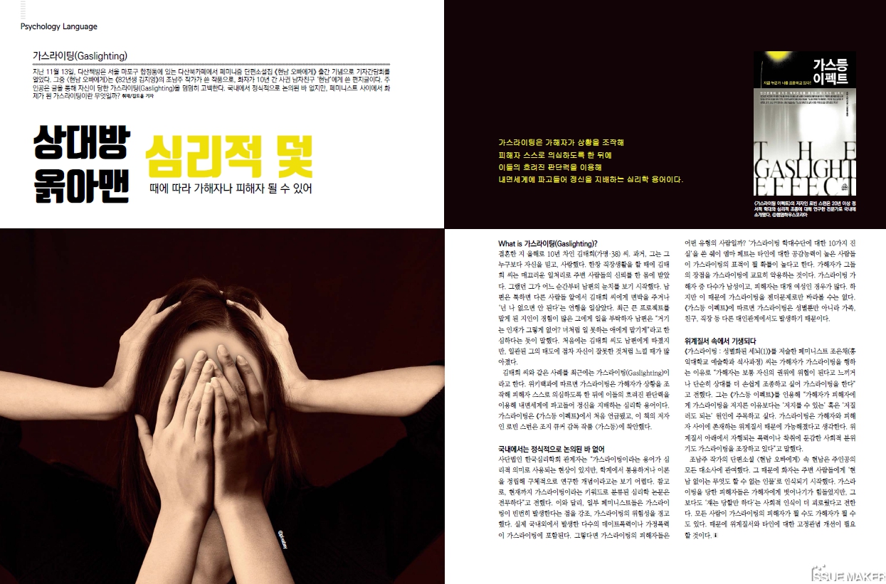 가스라이팅은 어느 사람의 심리상태를 교묘하게 조작하여 그 사람이 자기 자신에 대하여 불신하도록 해주고 가해한 인류에게 정도가 심하게 의존하게 생성하는 심리적 학대를 뜻하며 심리적 지배라고도 하고요. 가스라이팅 1938년 연극 '가스등' 연극에서 유래한 용어로 현실인지 실력을 잃고 가해자에게 의존하게 만들어요.