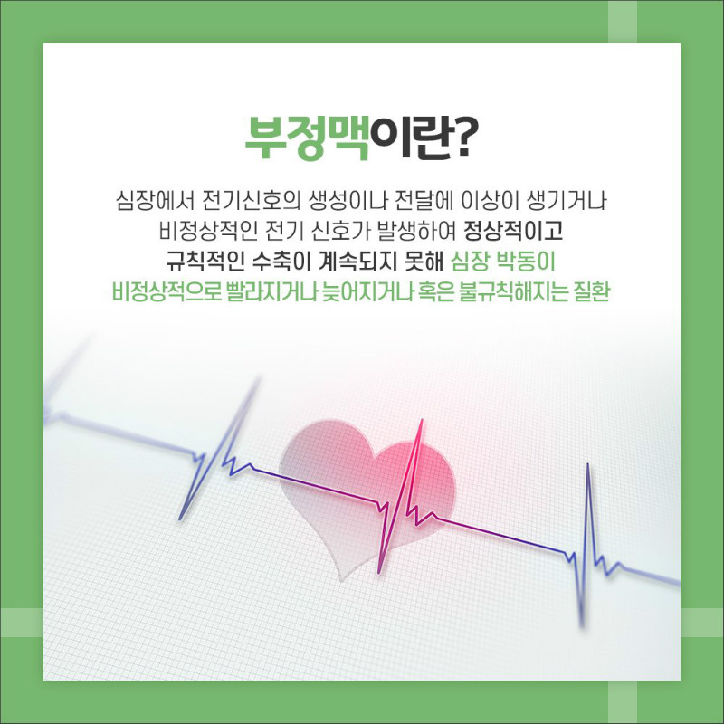 부정맥 증상으로 급격히 부정맥이 형성되는 경우 환자들은 가슴 통증을 느끼기도하더라고요. 또한 정말 스쳐 지나가는 느낌만 나는 경우도 있으며 흉부의 불쾌감을 체감할 수도 있다고하더라고요. 때문에 부정맥이 협심증 및 심근경색 등 심장의 혈액순환 장애로 인해 나타나게 되는 경우에는 협심증 및 심근경색 질병으로 가슴이 조이고과하게 뻐근한 흉통을 깨닫을 수 있답니하더라고요. 따라서 부정맥이 아니더라도 가슴 통증인 능히 넘길 증상이 아니기에 병원을 틀림없이 내방하시기 바랄게요.