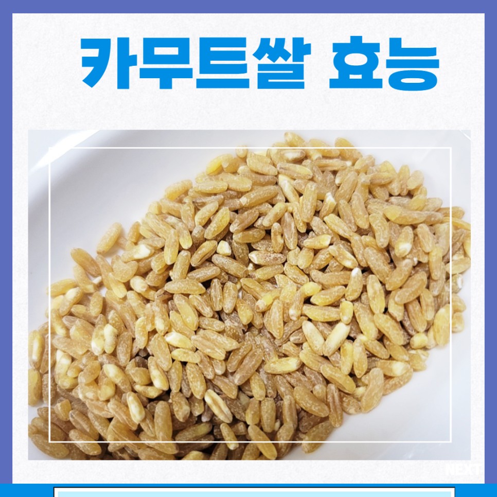 카무트 효능 -카무트에는 셀레늄을 망라하여 단백질과 마그네슘 등과 근사한 필수 아미노산이 많이 망라되어 있습니다. 우리 건강을 신장시키고 다양한 성인병을 방지하더라고요. 또한 콜레스테롤 수치를 감소시켜주며 혈당제어을 돕습니다. 체중조절에 도움 카무트는 혈당지수가 낮고 포만감또한 오래도록 유지되기도 합니다 많이 가지고 있는 식이섬유까지 함유하고 있어 좋은 다이어트 식품이라고 할 수 잇습니다. 다이어트에 좋다고 하는 고구마의 혈당지수가 46인데 비해 카무트 쌀은 40으로 고구마를 대체할 체중조절 식품으로 각광받고 있습니다.